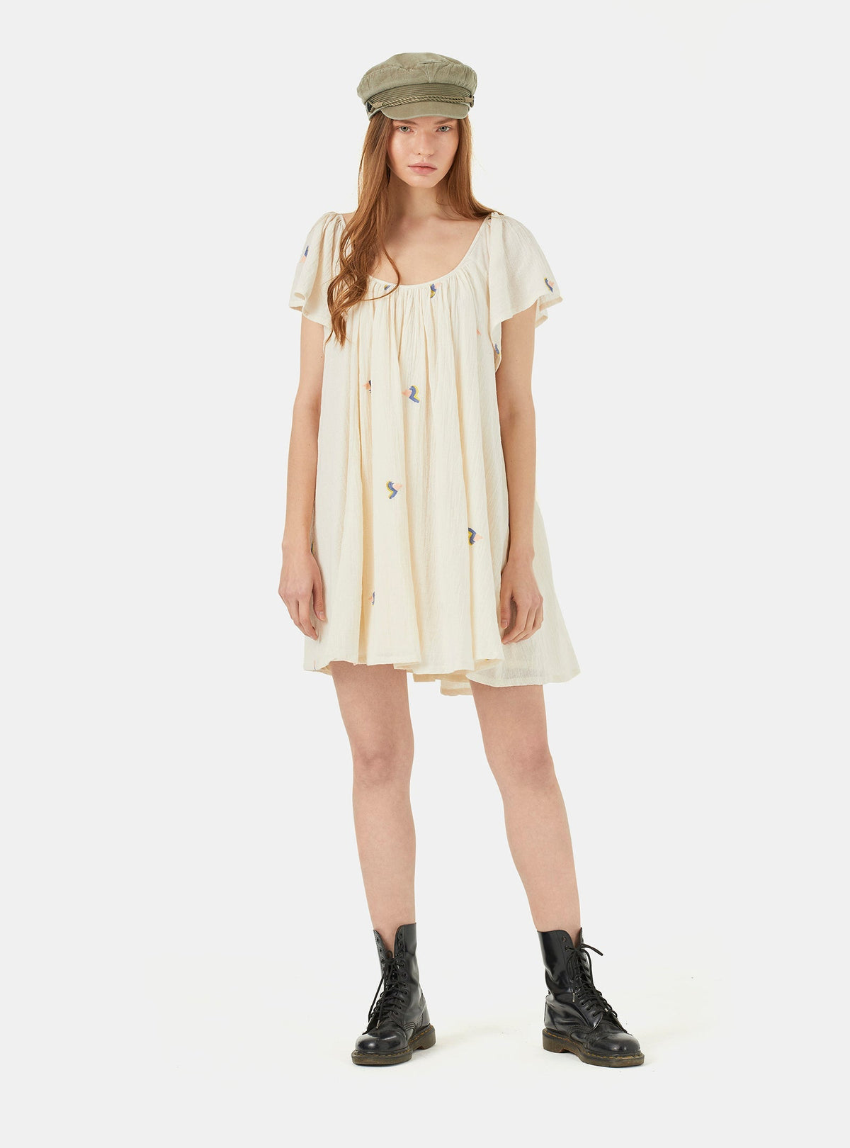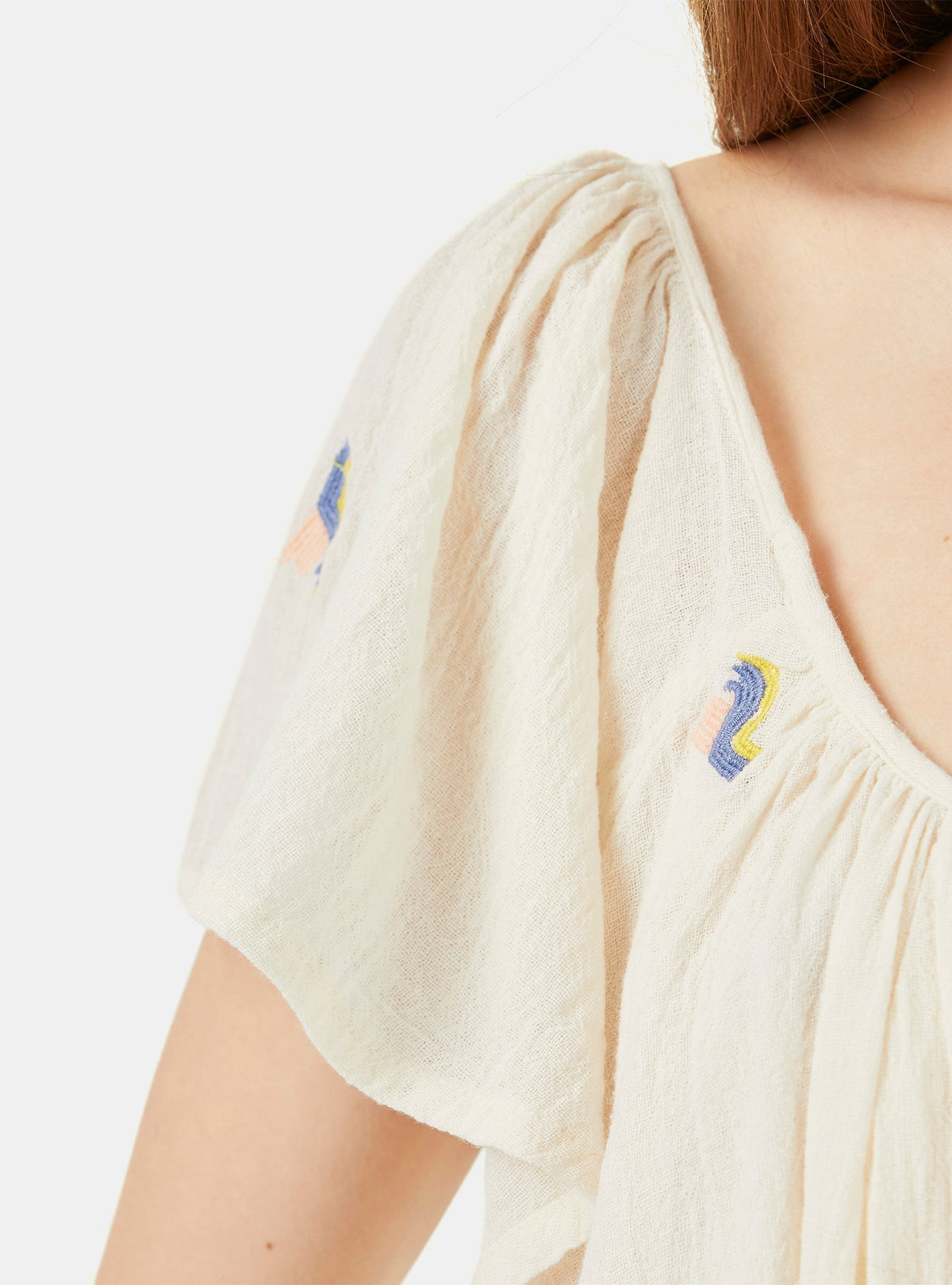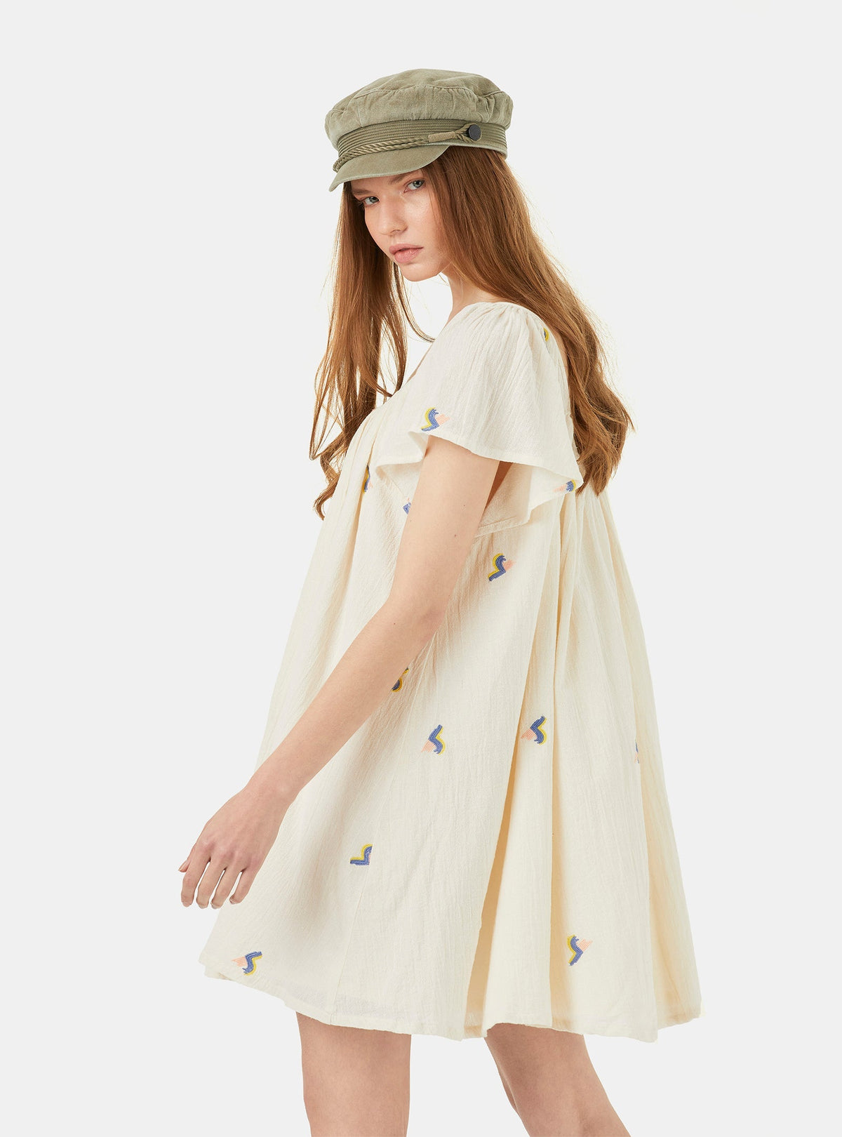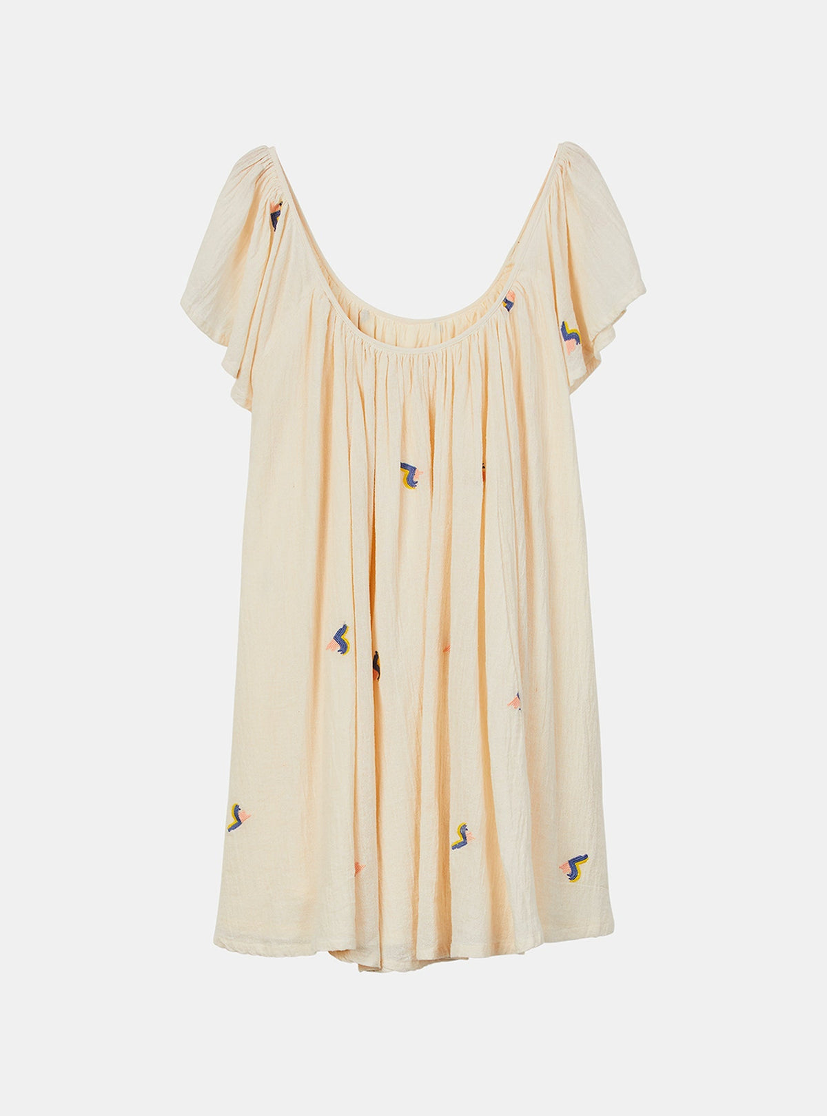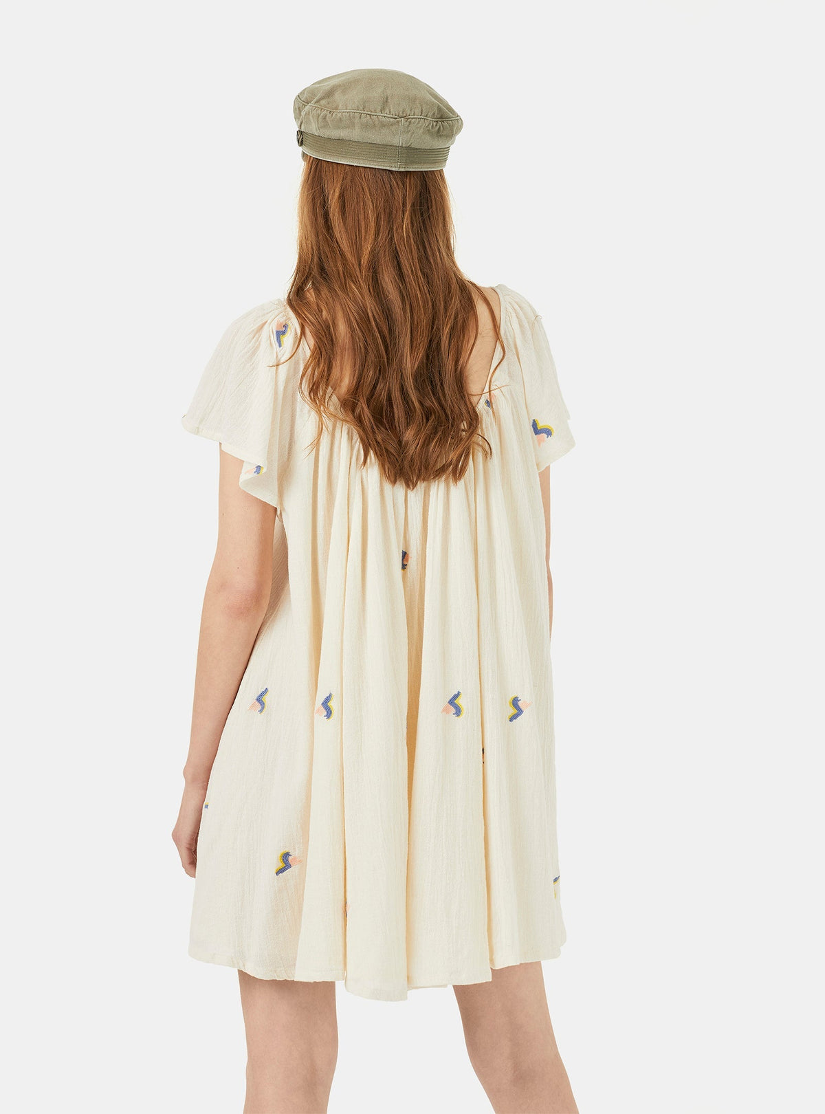 Vestido em algodão, curto e com silhueta evasé. Feito a partir de uma qualidade de crepe esvoaçante, com desenhos de bordados allover, motivos em ondas pastel. O tecido de textura enrugada na cor areia clara dá a riqueza e sofisticação de um boho renovado. As mangas são largas assim como o fundo, decotes frente e costas simétricos, com alguma largura e profundidade. Leve, respirável, feminino e contemporâneo.